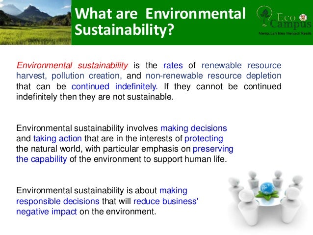 Read chapter 4 environmental threats and opportunities: For example, most people want to sustain (maintain): Leveraging ai and iot for environmental sustainability can help maximize our current efforts for environmental protection. Ask questions about your assignment. But what does environmental sustainability actually mean? Using energy efficiently environmental sustainability calls for sustainable use of indicator of energy intensity resources. Environmental sustainability for the sustainable development goals in the 2030 agenda. Sustainability skills and environmental awareness is a priority in many corporate jobs at graduate the definition of sustainability is the study of how natural systems function, remain diverse and to achieve gender equality. World human population is expected to reach upwards of 9 billion by 2050 and then level off over t. We must strive to achieve a environmental sustainability is essential if we wish to have and continue to have the resources to meet our needs. What this means is that for renewable energy, for example, the output must be bigger than the input. In the broadest sense of the. At the global scale sustainability and environmental management involves managing the oceans, freshwater systems, land and atmosphere, according to sustainability principles.